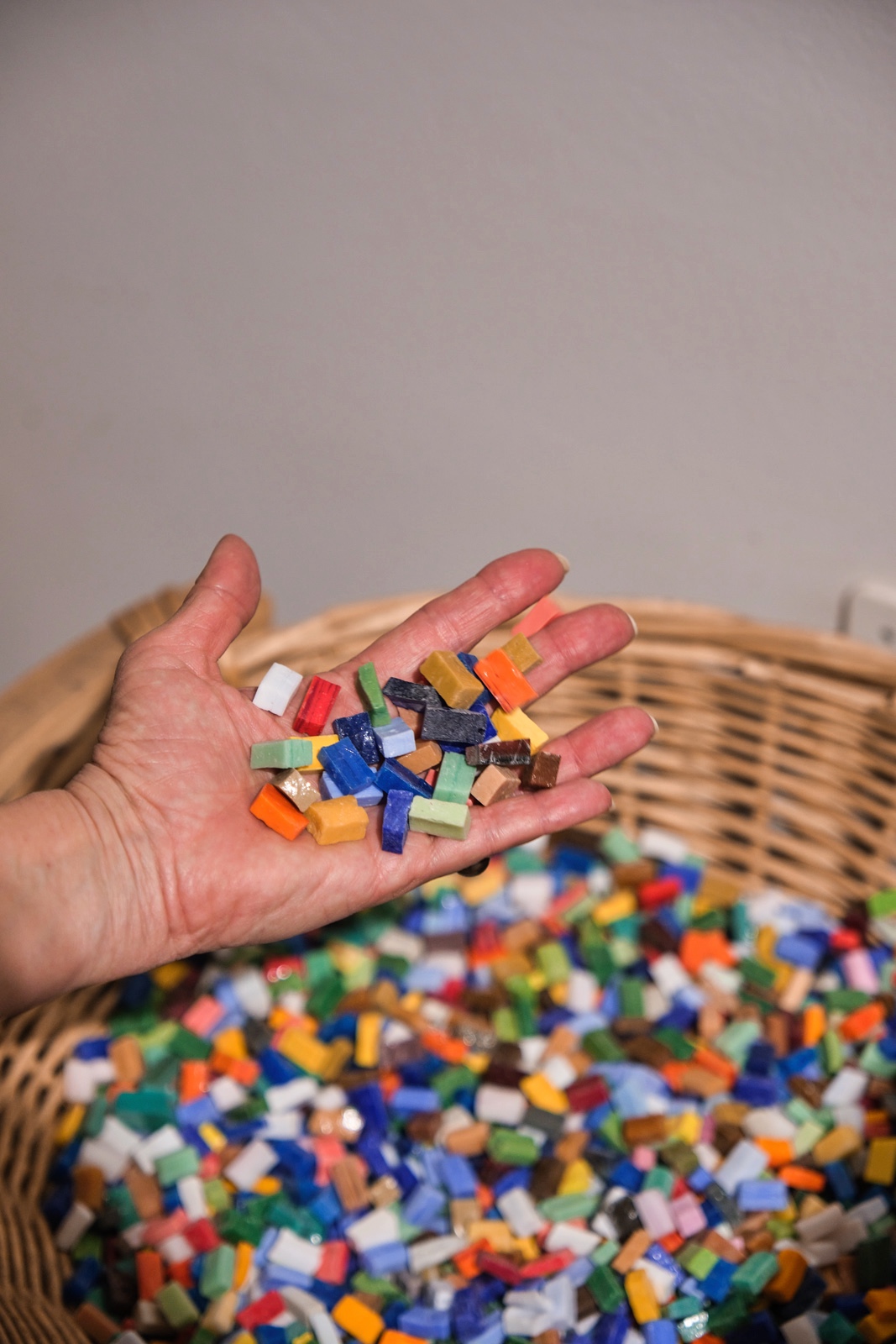 The tiles, even smaller than a millimeter in size, are obtained by spinning and cutting a glassy compound, or enamel, which constitutes the raw material, usually supplied by the famous Orsoni furnace in Venice, and then each image is composed by hand and inserted on 18K gold bases.